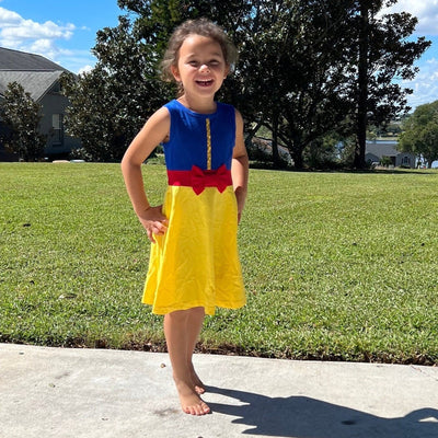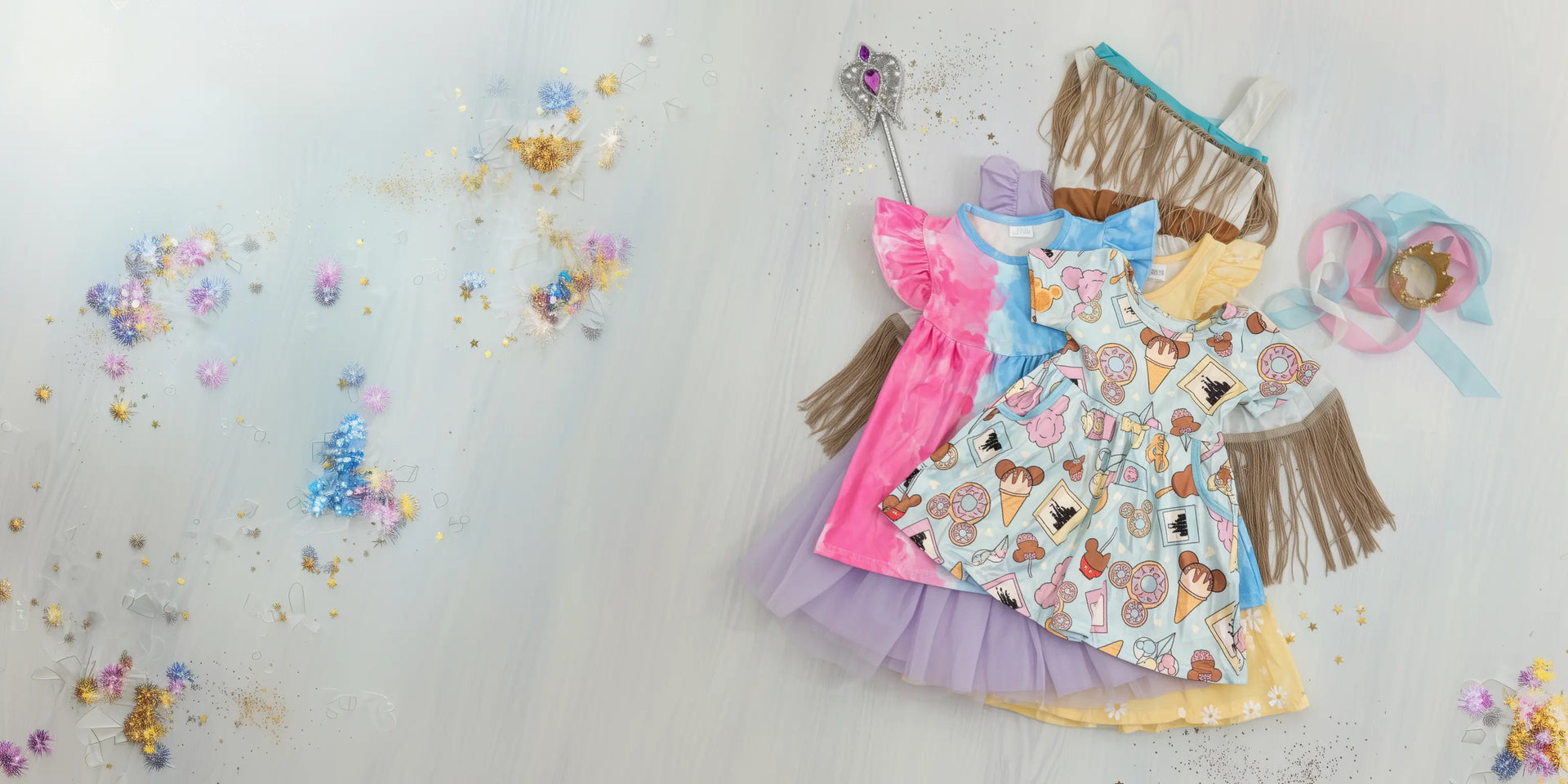Disney-inspired dresses and matching sibling outfits designed for comfort and imagination.